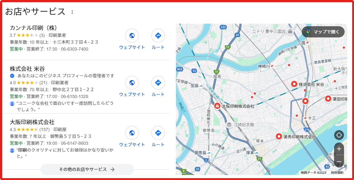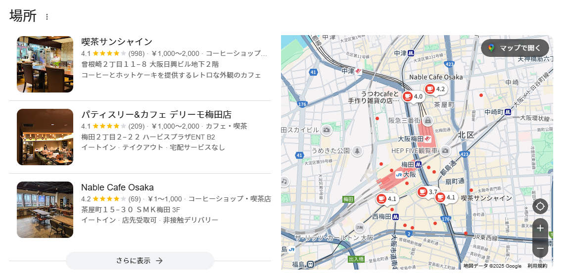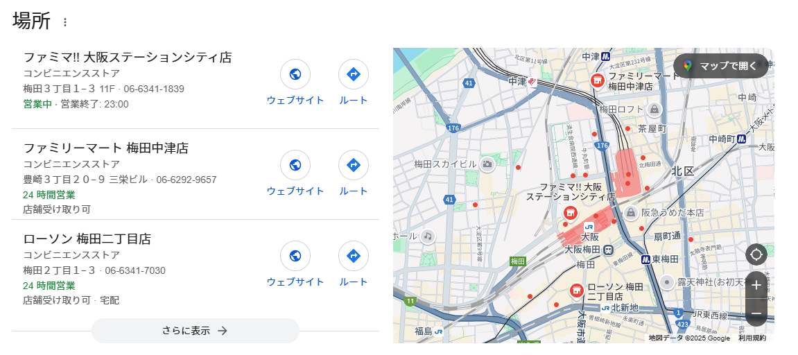 ローカルパックでは「店舗の情報+Googleマップ」の形式で表示されます。