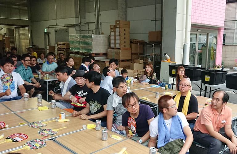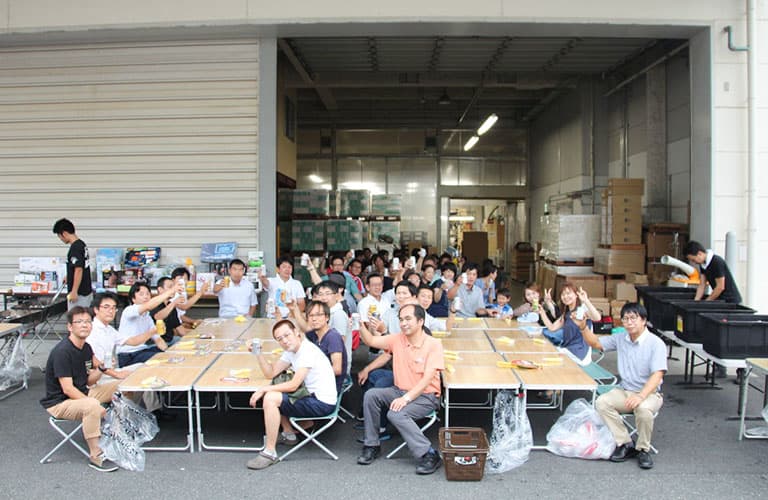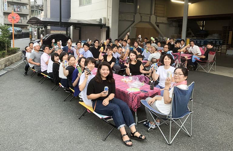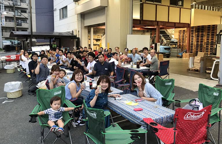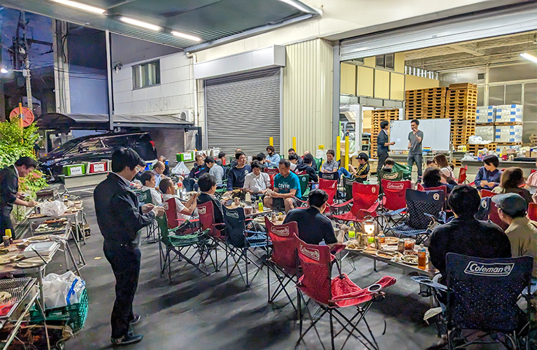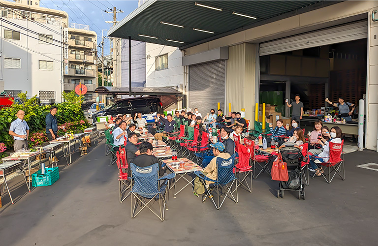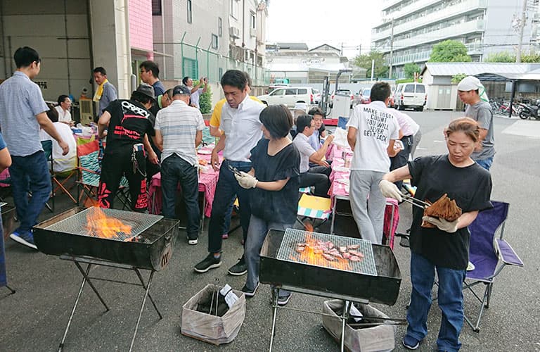 雨が多い日が続きましたが、この日はお天気に恵まれ、大変盛り上がりました。設営はいつもの出張バーベキュー会社さんに依頼し、お肉は社員の友人が営む鶴橋のお店で購入。社長が久しぶりに焼きそばを焼き、大好評でした。鶴橋のお肉はいつもながら抜群に美味しく、残ったお肉や食材もお持ち帰り用にすべて売り切れました。