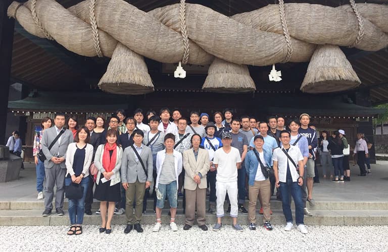 社内旅行で島根県に行って来ました。初日はひるぜん高原で昼食、そして足立美術館で13年連続日本一のお庭と日本画を見学。その後宿泊先の玉造温泉の玉泉さんへ。旅行2日目は出雲大社さんに参拝に。 拝殿で団体御祈祷をしていただき、社長が代表で玉串奉納をさせていただきました。その後、出雲さんを出発し、島根ワイナリーへ。試飲をしてそれぞれワインを購入。昼食は松江で有名な鯛めしのみな美さんでとりました。 最後にお菓子の壽城で試食をしつつ、お土産を各自購入。お昼からはお天気も急速に回復し、今回も雨の降らないジンクスが続く楽しい旅行となりました。