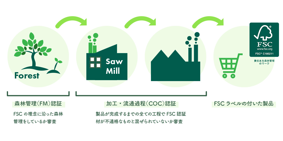 FSC認証は、森林の管理を認証するFM(Forest Management)認証と、加工・流通過程の管理を認証するCoC(Chain of Custody)認証の連鎖から成り立っています。FSC認証製品が消費者の手に届くまでには、森林から最終製品になるまでの生産、加工、流通に関わるすべての組織が認証を受けなくてはなりません。また、FSC認証の審査・発行は、FSCではなくASIという認定機関から認定を受けた独立した第三者の認証機関が行います。消費者は、FSCマークを目印に製品を選ぶことで、森林の生物多様性を守り、地域社会や先住民族、労働者の権利を守りながら適切に生産された製品を選んで購入することができます。