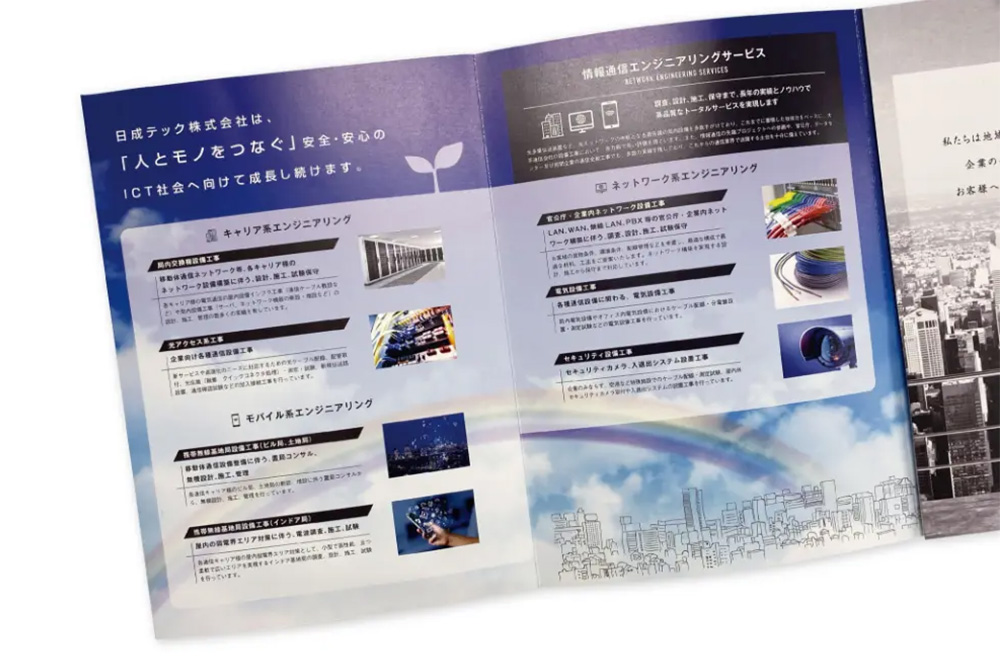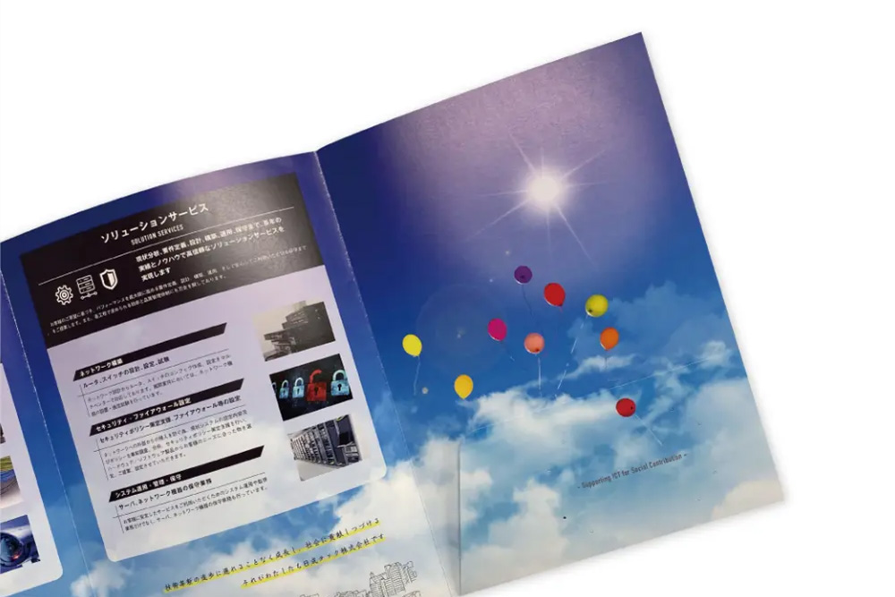 デザインが確定しましたら、印刷工程に入ります。ご希望の折り方や仕上げ加工(マット加工、光沢加工など)に従い、丁寧に仕上げます。