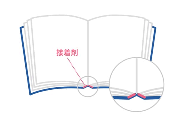 無線綴じの接着剤に、PUR系ホットメルト接着剤を用いた方法。通常の無線綴じよりも開きやすくなっているため、見開きでのデザインがしやすい、ノド部分が見やすくなるといったメリットがあります。また、耐久性、耐熱性に優れており、屋外での使用にもお勧めです。通常の無線綴じに比べるとややコストが上がることと、接着に時間がかかるため加工日数が伸びるというデメリットがあります。