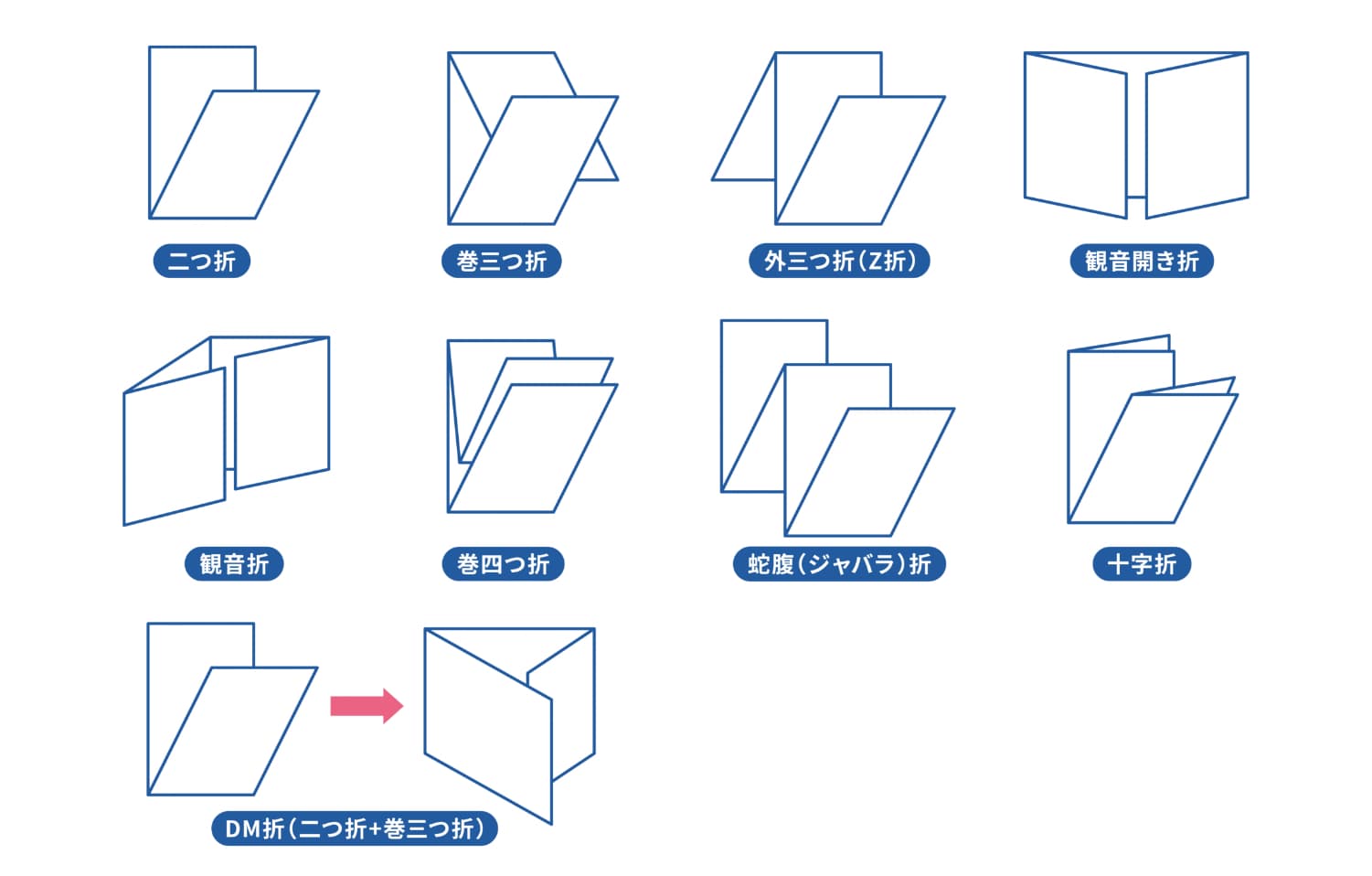 ラインミシン加工や、ミシン目が0.1mm~0.4mmと細かいピッチで、プリンターに引っかかりにくいマイクロミシン、ミシン加工が垂直やT字に入るジャンピングミシンなどがある。