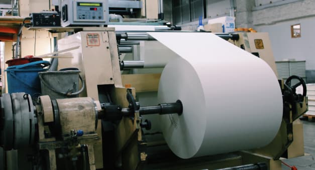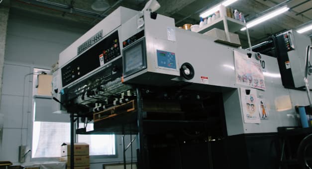 ロール状の用紙を使用し、高速かつ連続的に印刷するため、枚葉機よりも紙代も安く、大量の印刷物を短納期で印刷することが可能です。反面、スタート時の紙のロスが多いため、多品種小ロットの印刷物は逆にコスト高になり、適してません。新聞や折込チラシ、教材や雑誌などの大量部数の印刷物に適しております。当社の輪転機も主に学習教材の印刷の単色専用機として使用しております。
