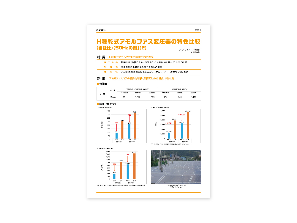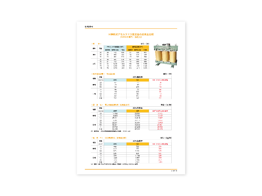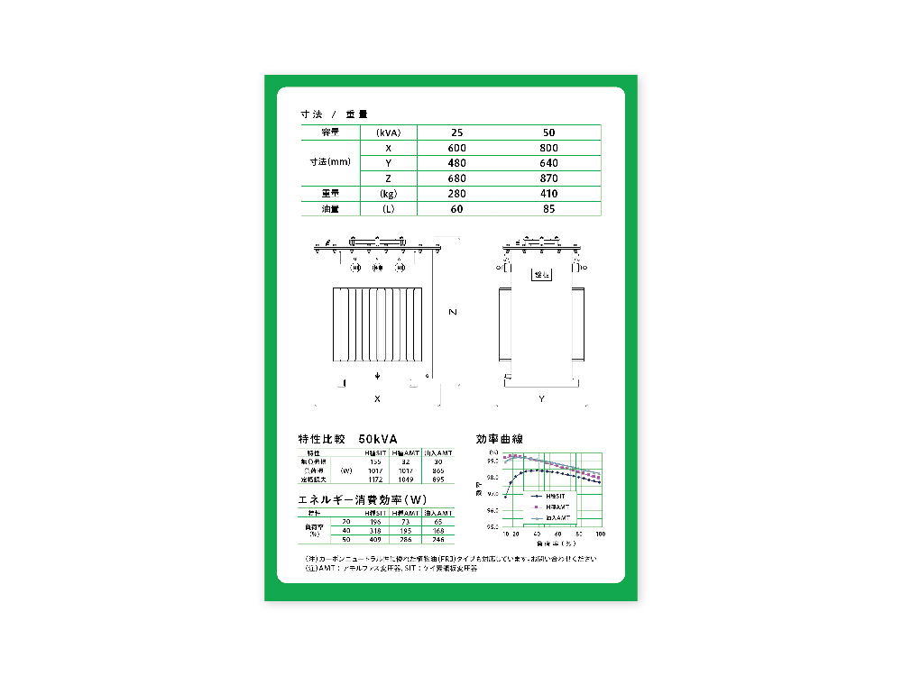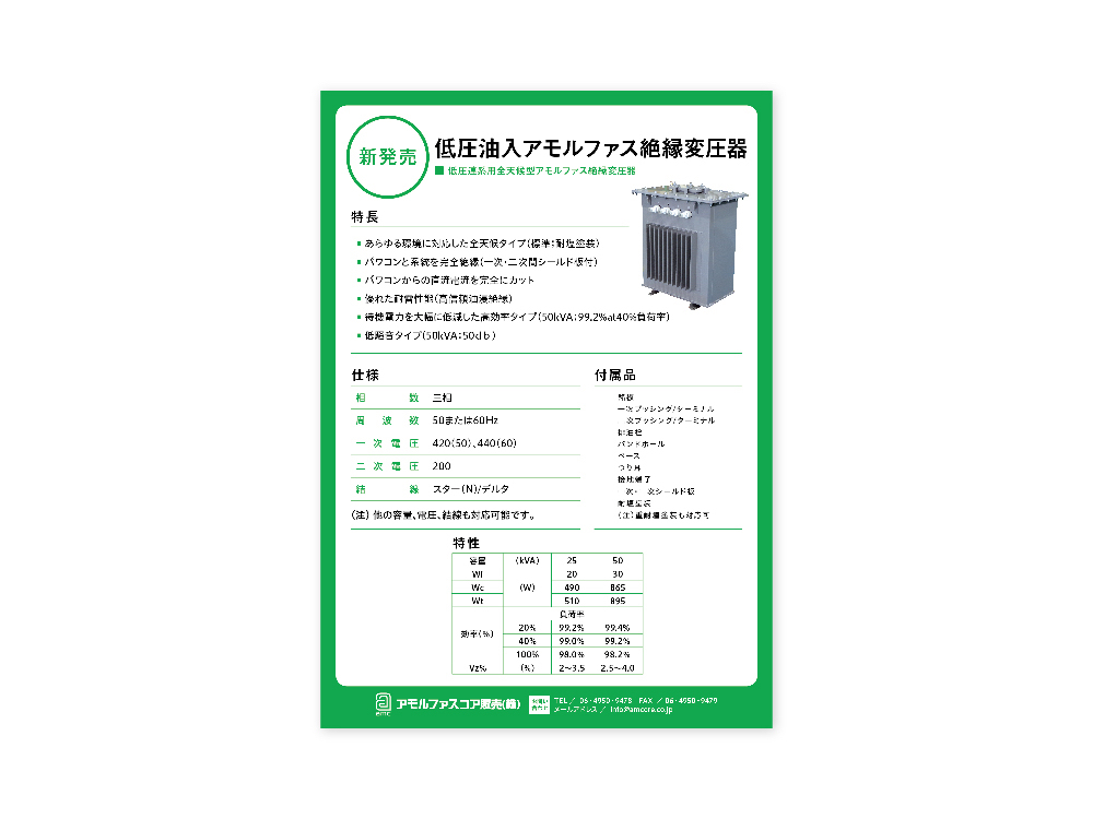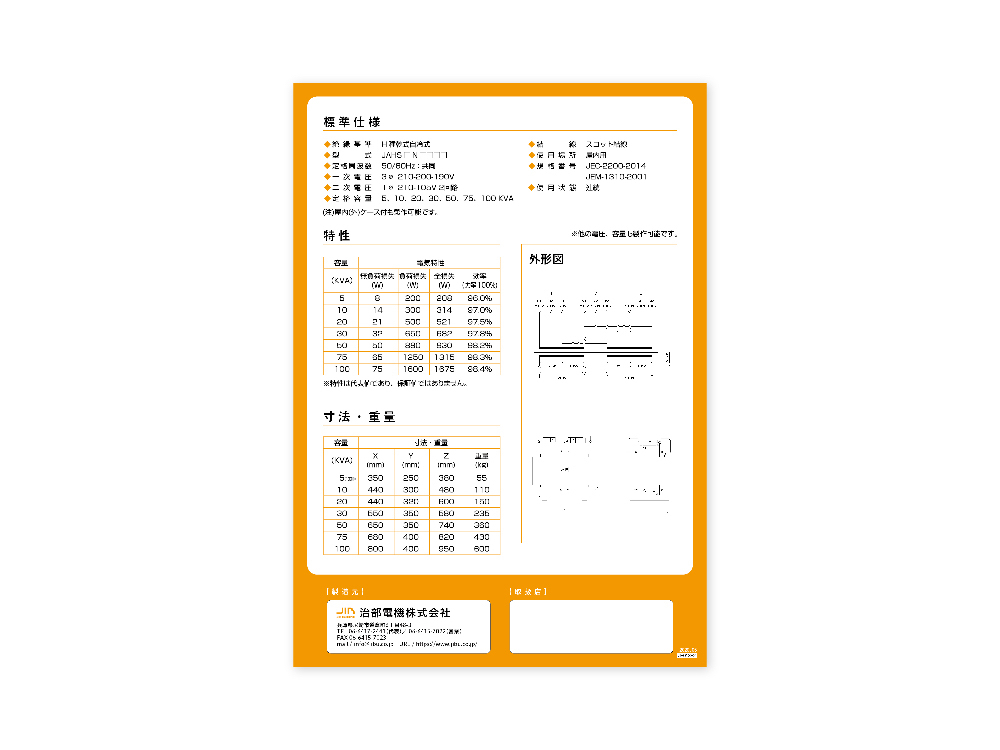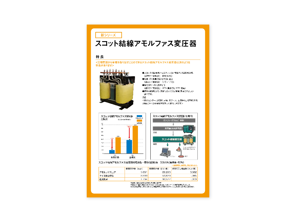 特殊変圧器の個別製品説明書です。その他製品も複数あるためベースカラーを決めてバリエーションで管理出来るようにしました。