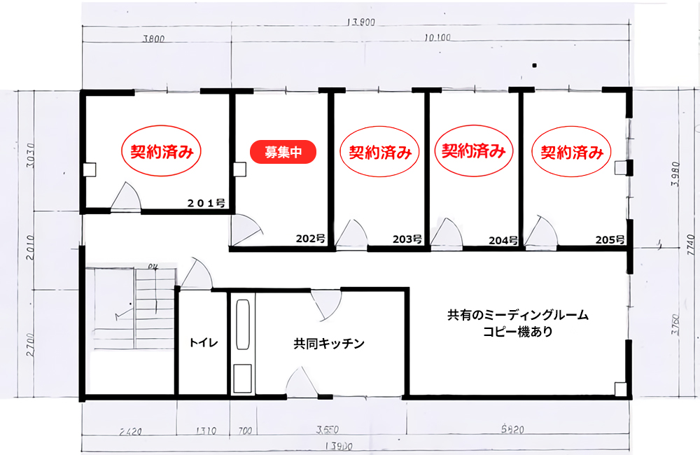 複合機・大型机などは、共有のミーティングルームで利用可能