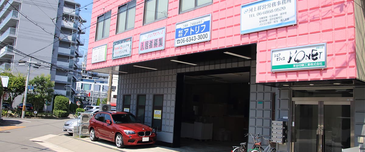 阪急十三駅から徒歩10分の場所にある当社の向かいにあるシェアオフィスです。ウェブデザイナーやDTPデザイナー、もちろんその他の業種の方も大歓迎です。特に独立自営業の方や、今までご自宅などで仕事されていた方にお勧めです。